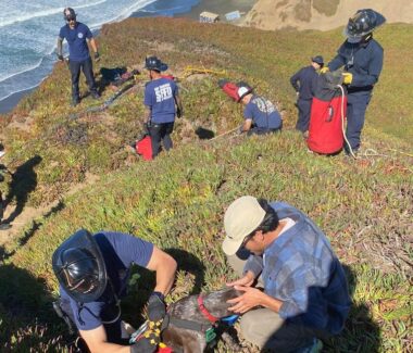A San Francisco dog happily wags its tail and showers kisses on its rescuers after being rescued from the edge of a cliff. A pet dog tumbled off an oceanside...