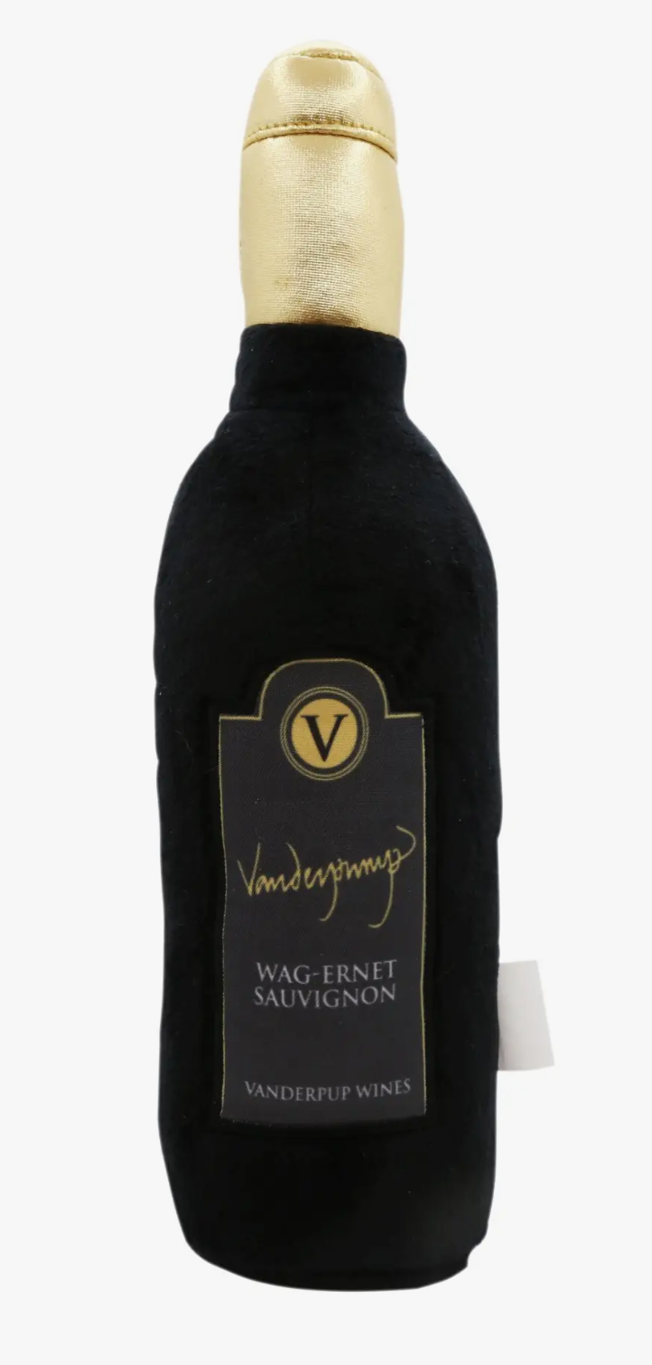 Just like our carefully curated wine menu at PUCCI Cafe, we offer a selection of wine bottle dog toys for your stylish pup. Presenting the charming Vanderpup Wag-ernet Sauvignon Wine Plush Dog Toy, part of the Vanderpump Pets collection. This plush wine bottle toy is made from soft materials and features a fun squeaker inside.