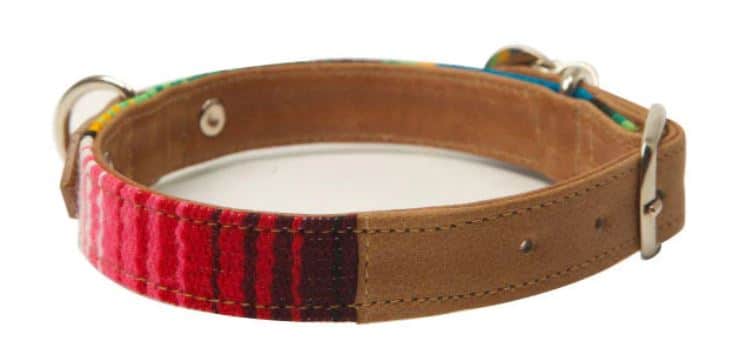 Dog collar featuring hand-worked sarape-style fabrics stitched onto 100% chrome-free leather using only water-based dyes (to reduce pollution), with gold-plated zamak hardware (zinc, aluminum, copper and magnesium) for guaranteed resistance and durability. Handmade by local artisans. Dog collar evoking the beauty of Mayan culture. The accessories are hand-made using traditional leatherworking techniques that ensure excellent quality. They are hypoallergenic for your pet’s comfort and safety.