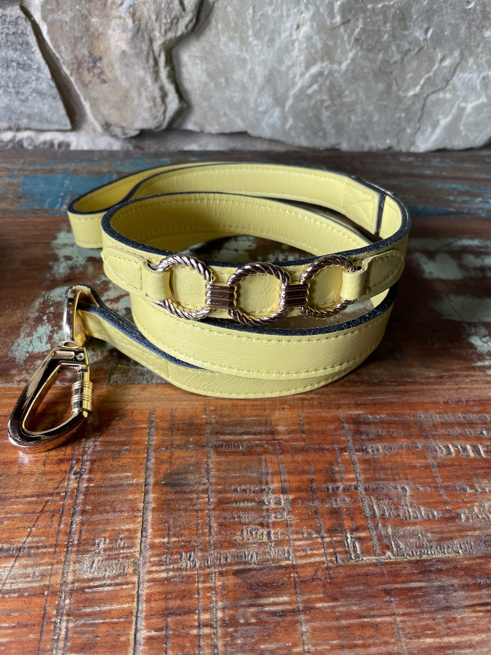 Elegance personified. This gorgeous soft Italian full grain Athena Canary Yellow Leather Leash with the Icon is so elegant. Its finished on both sides. Its Easy on and off dog clip has a polish gold finish, from Italian hardware. It would match perfectly with the Athena Canary Yellow with Gold Collar. An iconic look to classic high fashion.