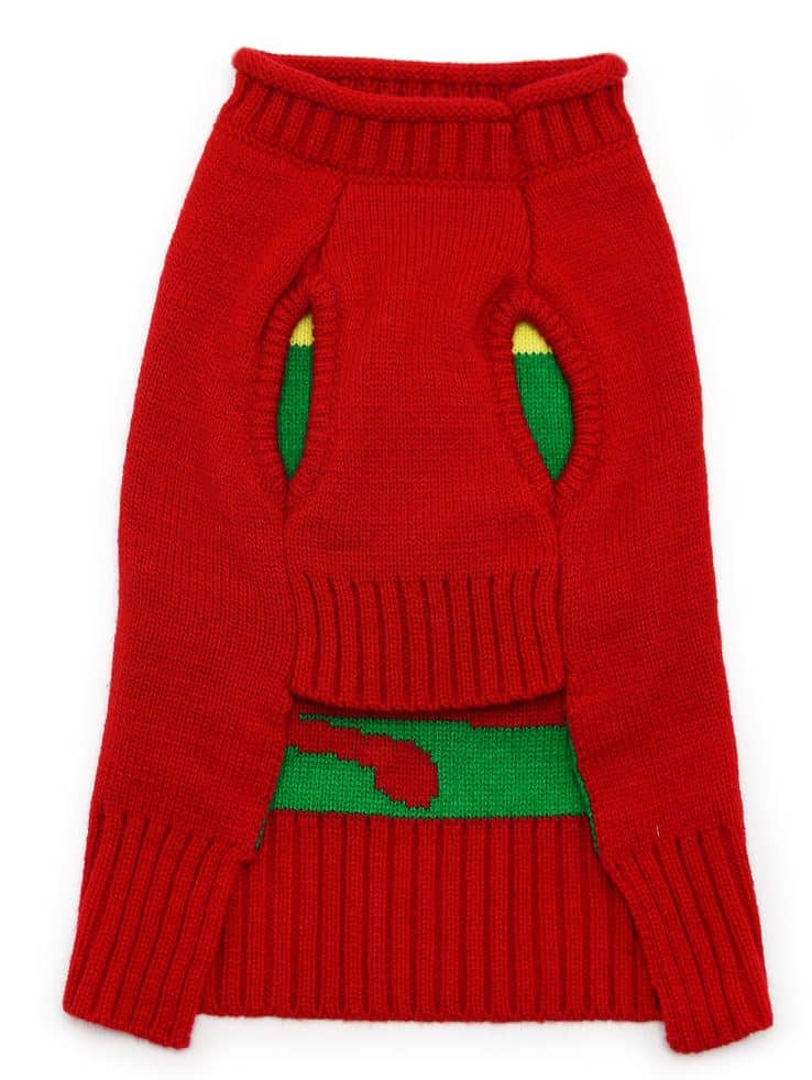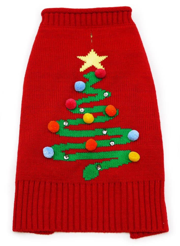 Christmas Tree dog sweater at PUCCI! This festive holiday sweater featuring modern twisting Christmas tree design with a popped out pompoms ornaments on the Christmas Tree adds a cute touch to your pups sweater. Comes with a leash hole for easy access to their collar or harness.