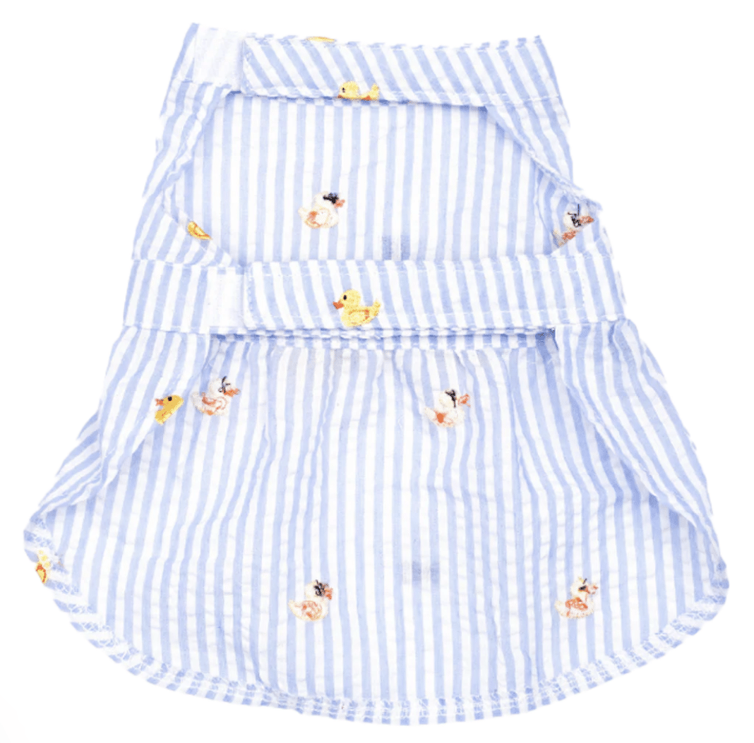 This Light Blue Stripe with Yellow Ducks Dog Dress is a fabulously stylish choice for your furbaby in any springtime setting. The fabric features a preppy striped design, embroidered ducks and a bright yellow bow at the back waist that perfectly complements the cheerful yellow ducks. Whether for everyday wear or a special occasion, this dress makes dressing up quick, easy, and irresistibly cute.