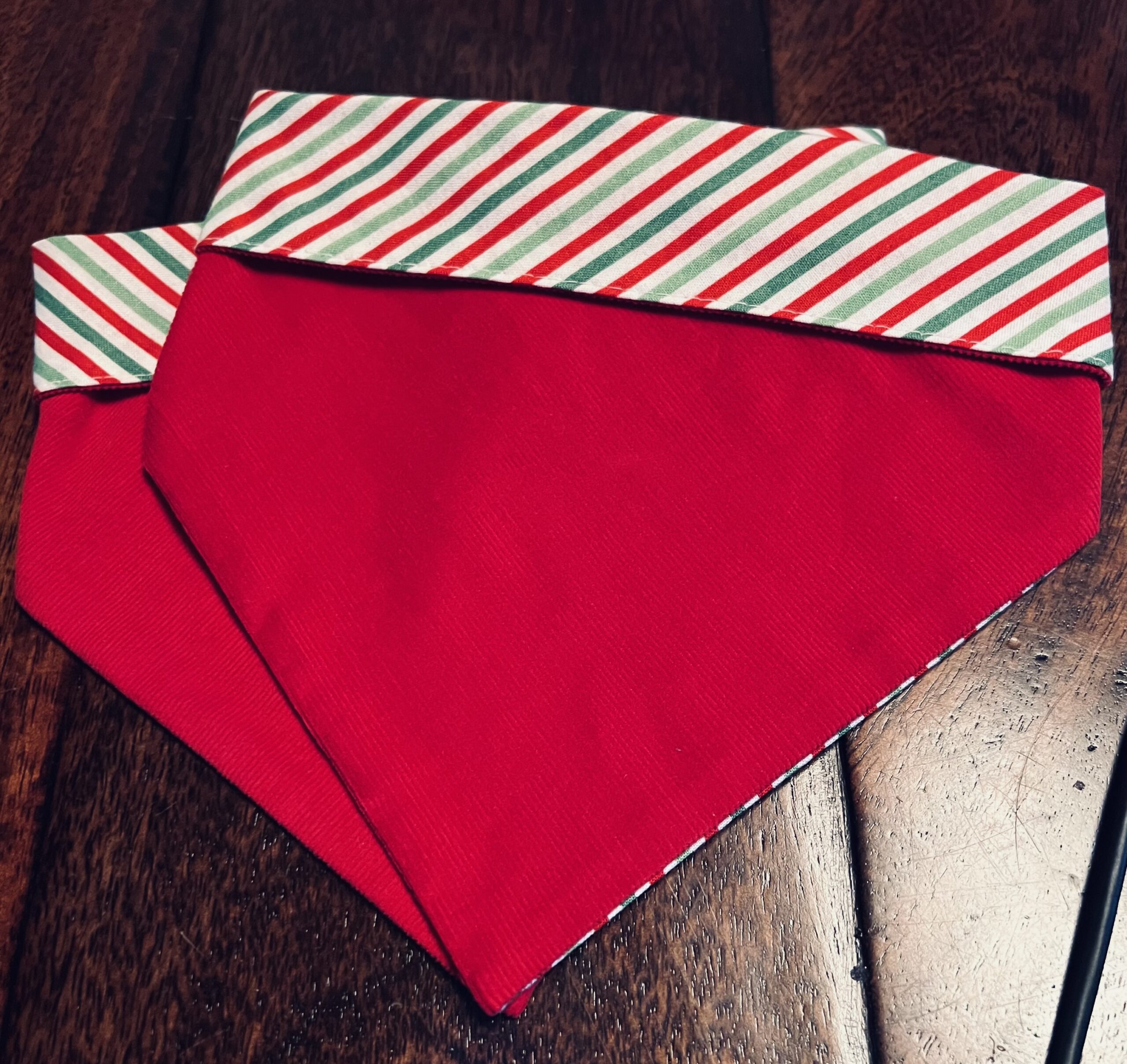 Have your puppy ready for Christmas in this cute Red Corduroy with stripe reverse side Dog Bandana. Hand made in the USA. Easy to clasp clip.