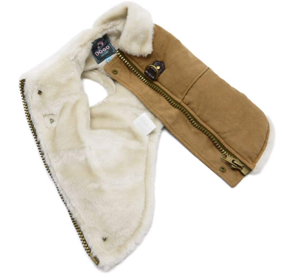 This classic coat features warm insulated faux fur lining, a vintage top zipper closure, and a coordinating sweater trim. Sizes XS to XL include a D-ring for leash attachment, while sizes 2XL to 4XL are equipped with a buckle design.