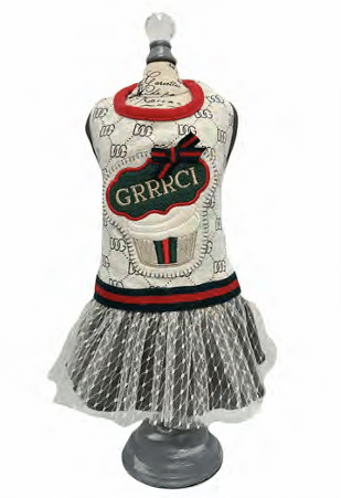 Style your pup in this adorable, designer-inspired ‘DOG’ pattern dress, featuring a charming GRRRCI Cupcake embroidered patch with a lacy flared skirt. Made from 100% ultra-soft cotton for maximum comfort and cuteness.