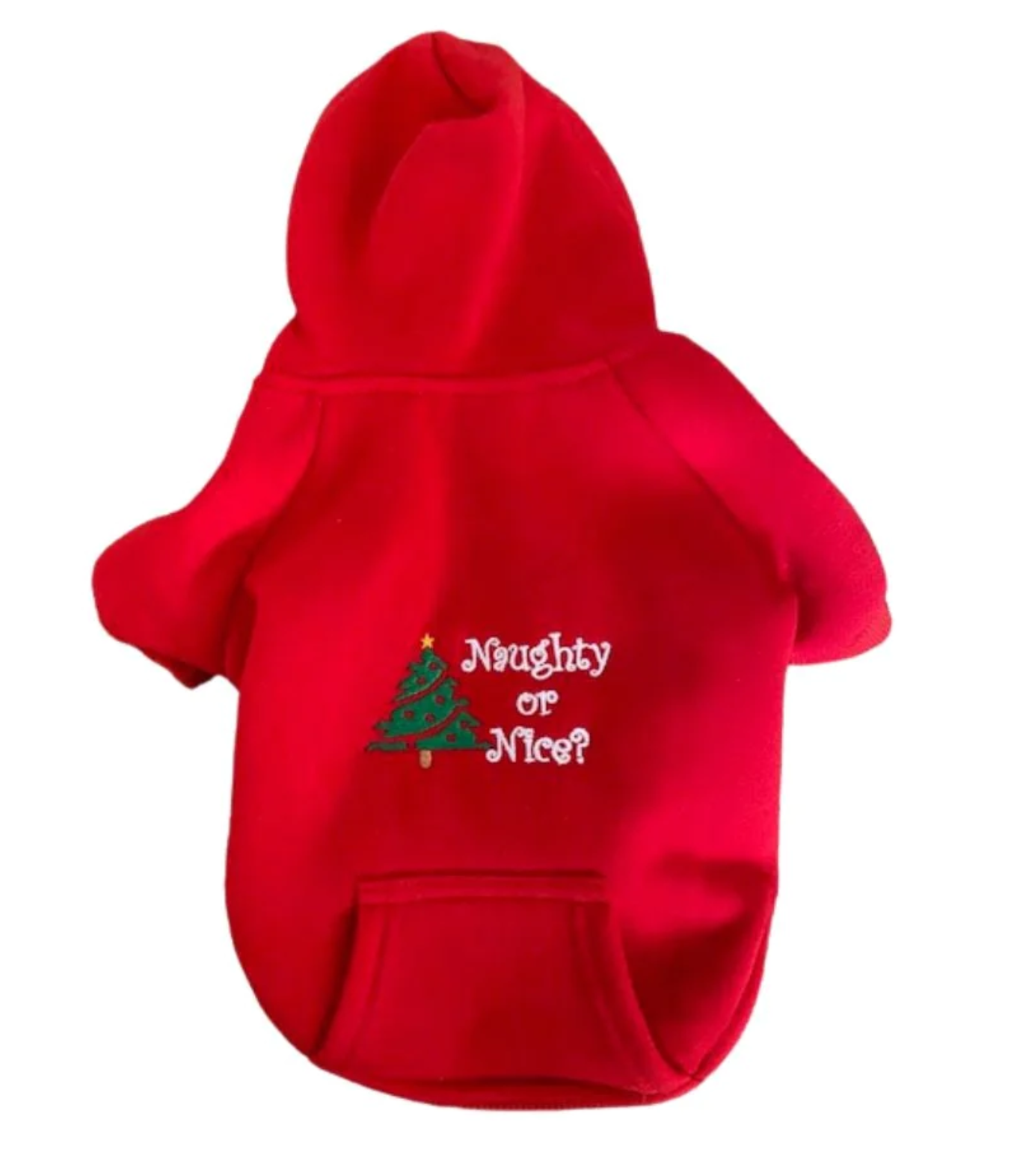 This cute soft red “Naughty or Nice?” jersey sweatshirt would be perfect to start the Holiday nice and cozy for your fur baby. Comes with short sleeves, drawstring and snap on buttons.