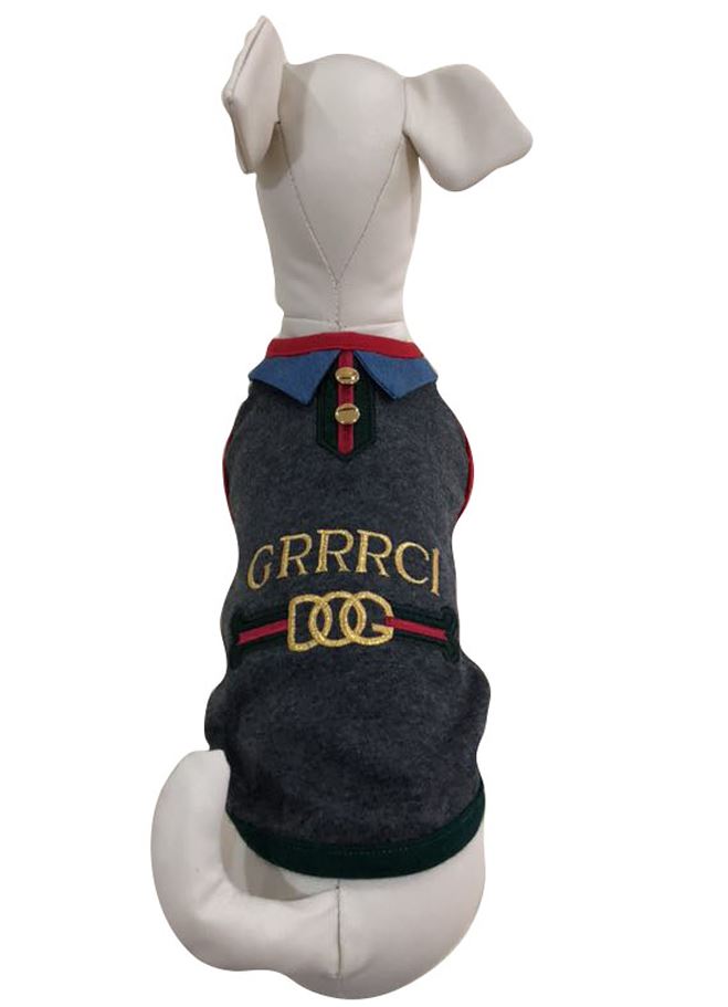 Your pet deserves to look and feel effortlessly stylish in this adorable dark gray ‘GRRRCI DOG’ designer tank, featuring an embroidered logo, preppy denim collar, classic button details, and bold red trim. A fashionable choice for both boys and girls fur-babies.