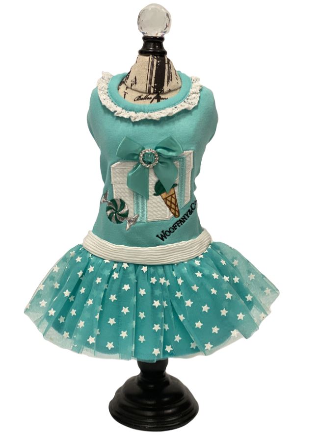 Your pet deserves to look and feel like a princess in this cute designer dress. It is a parodied after the well known Tiffany & Co. in Tiffany Blue.