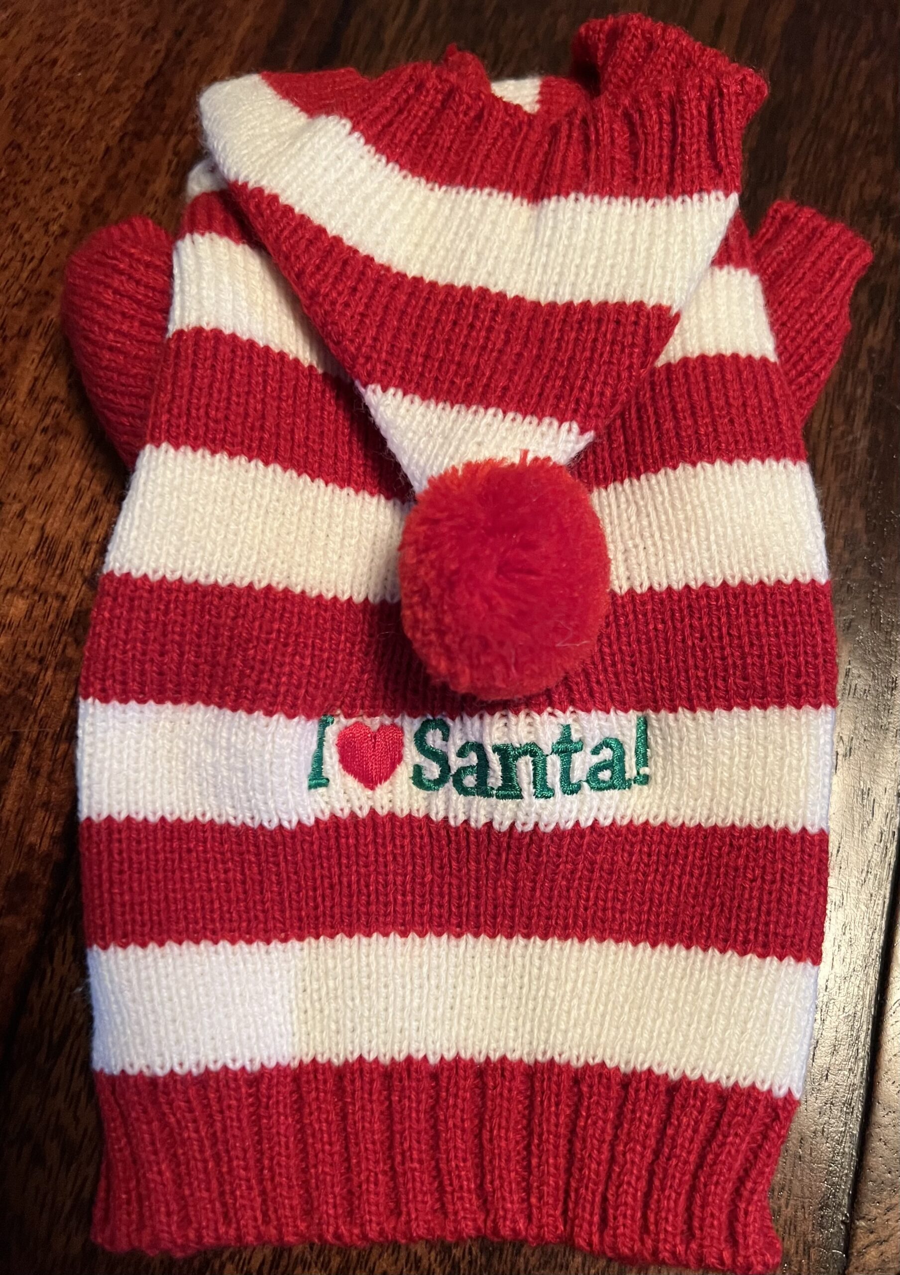 This adorable red and white “I Love Santa!” hoodie sweater with short sleeves is perfect for keeping your furry baby cozy this holiday season.