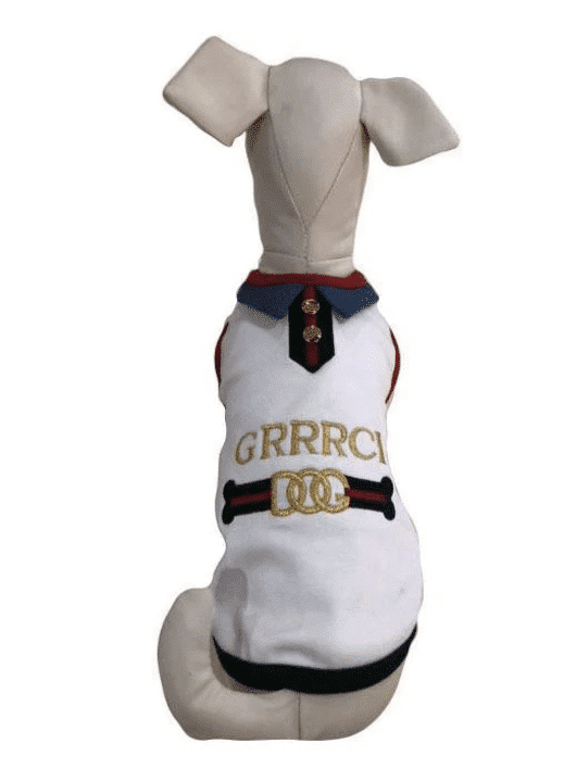 Your pet deserves to look and feel effortlessly stylish in this adorable white ‘GRRRCI DOG’ designer tank, featuring an embroidered logo, preppy denim collar, classic button details, and bold red trim. A fashionable choice for both boys and girls fur-babies.