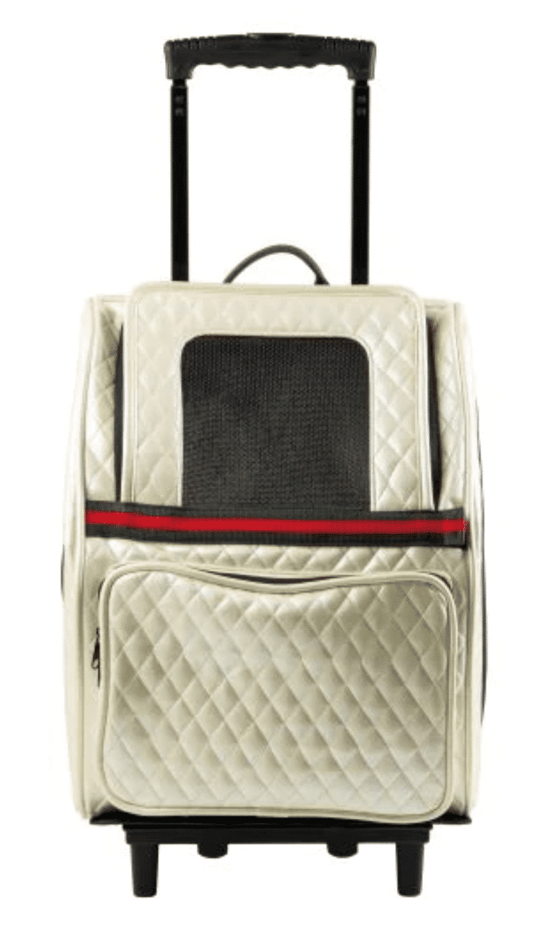 Introducing the Ivory Quilted Rio Bag On Wheels. Travel in style with this amazing 3 in 1 pet carrier on wheels. Shown here in a stylish Ivory quilted fabric with a style stripe design in front and on the handle.