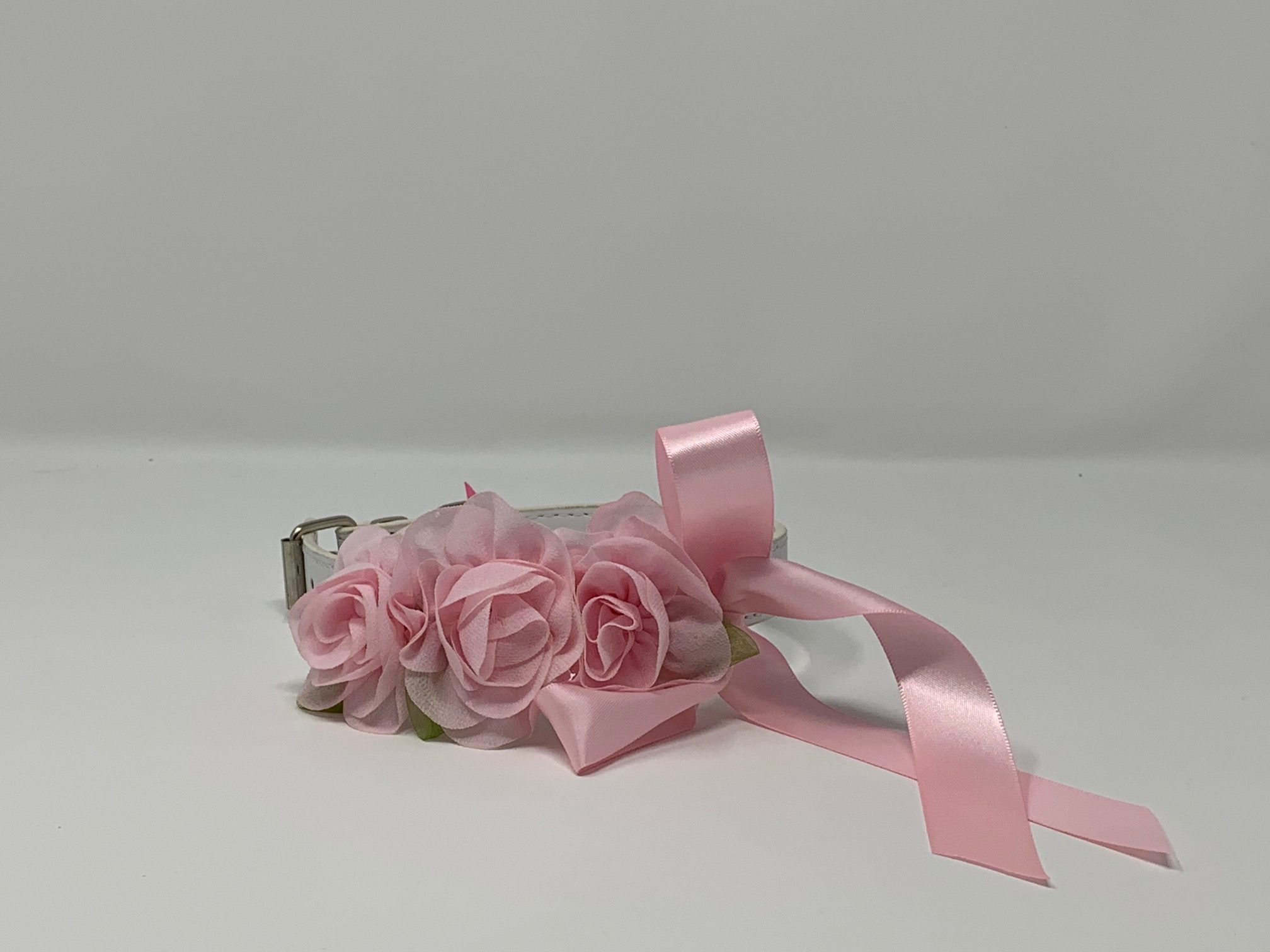This beautiful white collar is embellished with pink flowers and a pail pink ribbon. A gorgeous touch for your little girl on your wedding day or any special occasion. This comes in a X Small and Small.
